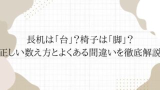 暮らしの豆知識 長机は「台」?椅子は「脚」?正しい数え方とよくある間違いを徹底解説 長机や椅子の数え方をわかりやすく解説。正しい助数詞「台」「脚」の基本から、会議・学校・イベントなどシーン別の使い分けまで紹介します。 暮らしの豆知識