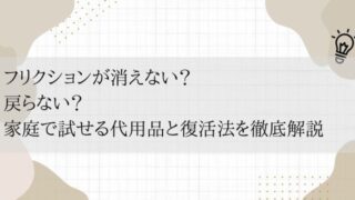 暮らしの豆知識 フリクションが消えない?戻らない?家庭で試せる代用品と復活法を徹底解説 消せるボールペン「フリクション」は、学生から社会人まで幅広く支持されている人気の文房具です。ペンの後ろに付いた専用ラバーでこすると、まるで鉛筆のように文字を消すことができるため、スケジュール帳やノート、さらには仕事の下書きなどにとても便利。... 暮らしの豆知識